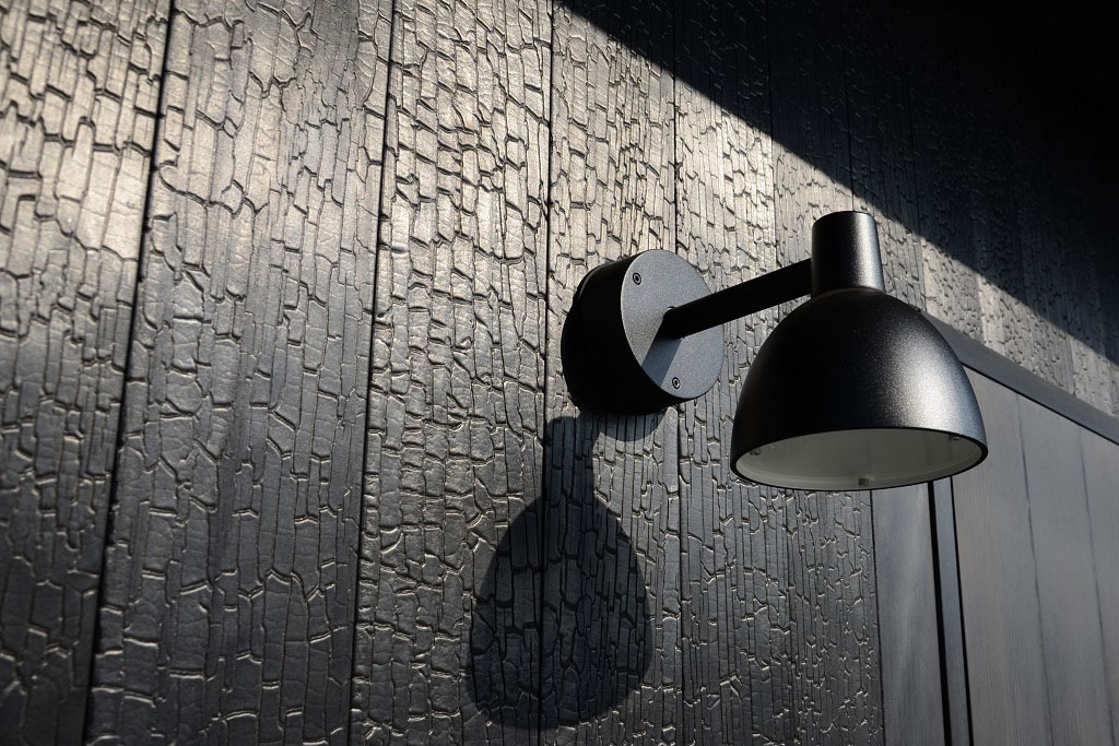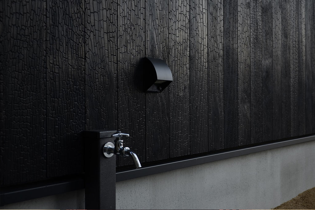 クロコは、西日本で伝統的に使われてきた焼杉の技法で表面が焼かれたアコヤの羽目板です。独特の質感と、見る角度や周りの明かりで表情が変わるクロコはデザインの主役としてもアクセントとしても使えるインパクトのある素材です。従来の焼杉と比べて、クロコは炭化された表面が硬く、欠けにくく、もちろんアコヤの防腐性能の保証も適用されます。