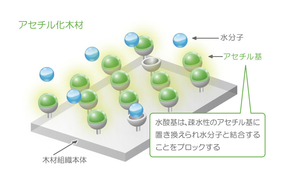 木材のセルロースやリグニンなどの成分に含まれる水酸基に酢酸を化学的に結びつけることで、